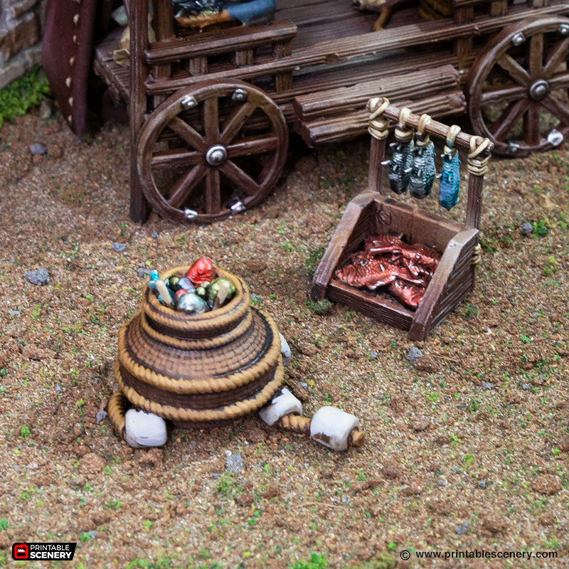 Bring the scent of the docks and the bustle of the market to your tabletop with the Fishmonger, a detailed terrain piece depicting a busy vendor stall piled high with freshly caught fish. Nets, barrels, scales, and crates of seafood create an atmospheric scene that invites adventurers to browse, barter, or get swept up in town‑square intrigue.
